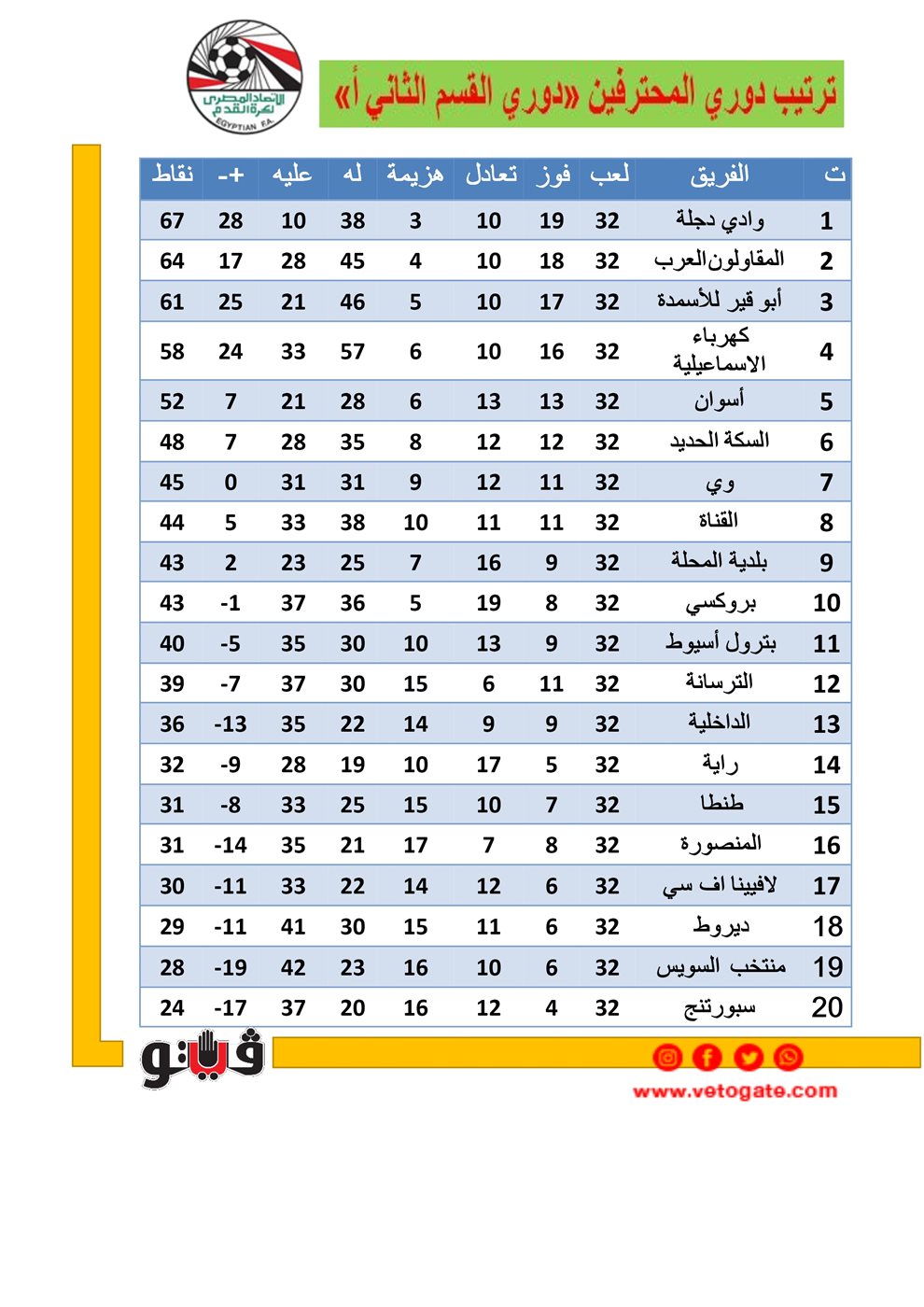 دوري المحترفين، يتصدر وادي دجلة قمة جدول ترتيب دوري المحترفين قبل انطلاق مباريات الجولة الـ 33 من المسابقة، بمشاركة 20 فريقا ويليه المقاولون في الوصافة.