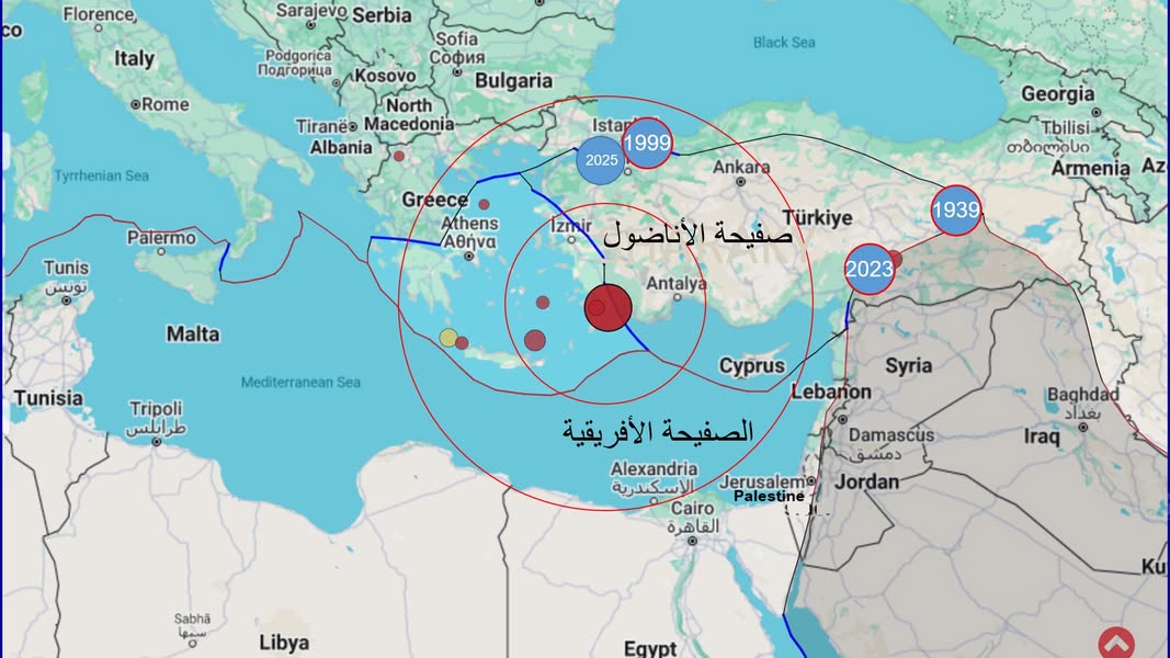 وأضاف: "يقع مركز الزلزال في مكان مختلف عن مواقع الزلازل المدمرة في تركيا (1939، 1999، 2023) حيث يقع على القوس القبرصي الذي يقع على الحد الفاصل بين الصفيحة الأناضولية في الشمال والصفيحة الإفريقية في الجنوب.