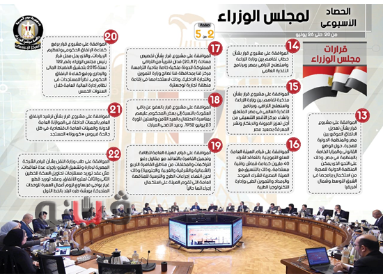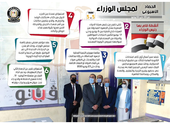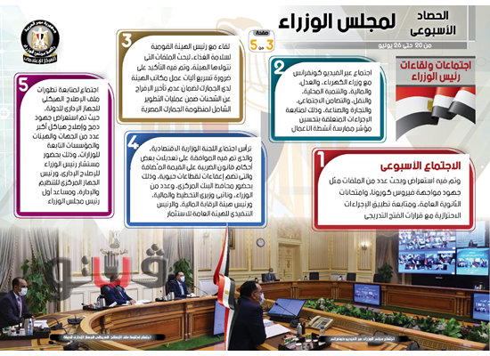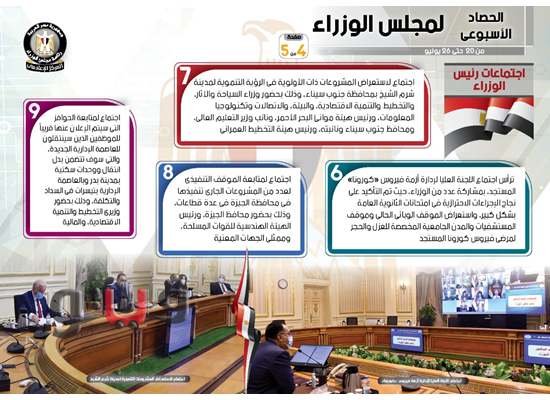 نشر المركز الإعلامي لمجلس الوزراء إنفوجرافاً سلط من خلاله الضوء على الحصاد الأسبوعي لمجلس الوزراء، وذلك خلال الفترة من 20 حتى 26 يونيو 2020، والذي تضمن الموافقة على عدد من القرارات، فضلاً عن الاجتماعات واللقاءات التي عقدها الدكتور مصطفى مدبولي، رئيس مجلس الوزراء، بالإضافة إلى ما قام به من أنشطة.