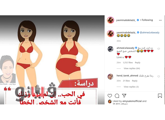 ونشرت ياسمين عبر حسابها الرسمي على موقع الصور الشهير "انستجرام" لسيدة سمينه وأخرى بوزن نجيف كاتبه عليها :" دراسة في الحب .. إن لم يزد وزنك فأنت مع الشخص الخطأ"