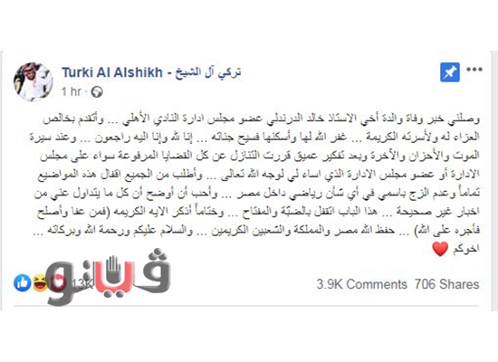 وكتب آل الشيخ، على حسابه الشخصي بموقع التواصل الاجتماعي فيسبوك قائلًا: "وصلني خبر وفاة والدة أخي الأستاذ خالد الدرندلي عضو مجلس إدارة النادي الأهلي.. وأتقدم بخالص العزاء له ولأسرته الكريمة.. غفر الله لها وأسكنها فسيح جناته.. إنا لله وإنا اليه راجعون.. وعند سيرة الموت والأحزان والآخرة وبعد تفكير عميق قررت التنازل عن كل القضايا المرفوعة سواء على مجلس الإدارة أو عضو مجلس الإدارة الذي أساء لي لوجه الله تعالى.. وأطلب من الجميع إقفال هذه المواضيع تمامًا وعدم الزج باسمي في أي شأن رياضي داخل مصر.. وأحب أن أوضح أن كل ما يتداول عني من أخبار غير صحيحة.. هذا الباب اتقفل بالضبّة والمفتاح.. وختامًا أذكر الآية الكريمة (فَمَنْ عَفَا وَأَصْلَحَ فَأَجْرُهُ عَلَى اللهِ).. حفظ الله مصر والمملكة والشعبين الكريمين.. والسلام عليكم ورحمة الله وبركاته".