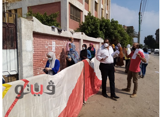 وأفراد أمن اللجنة بفناء المدرسة لمتابعة عملية تباعد الطلاب أثناء وبعد إتمام