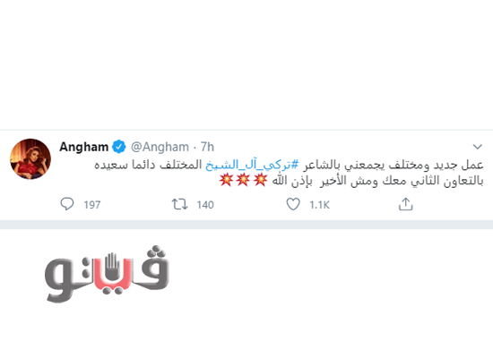 وكتبت أنغام، منشورا عبر عبر حسابها الرسمي على موقع التدوينات القصيرة "تويتر" :"عمل جديد ومختلف يجمعني بالشاعر تركي آل الشيخ المختلف دائما سعيدة بالتعاون الثاني معك ومش الأخير بإذن الله".