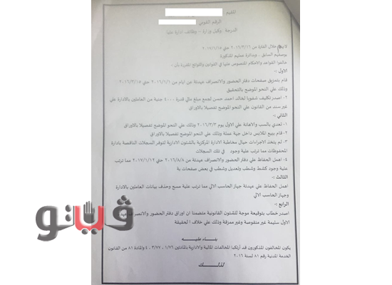 وأصدر سيد علي محمد، مدير منطقة جيزة أول بالضرائب خلال فترة عمله مدير الإدارة المركزية للشئون الإدارية "وكيل وزارة" خطابا بتوقيعه موجه للشئون القانونية متضمنًا أن أوراق دفتر الحضور والانصراف عهدة المحال الأول سليمة وغير منقوصة وغير ممزقة على خلاف الحقيقة.