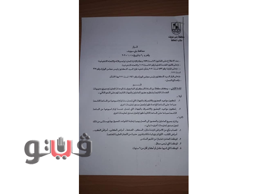 محمد هاني غنيم محافظ بني سويفاليوم الأحد قرارًا يحمل رقم 908 لسنة 2020 بشأن تنظيم