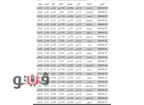 ويوضح الجدول مواقيت الصلاة اليوم كالتالي:،