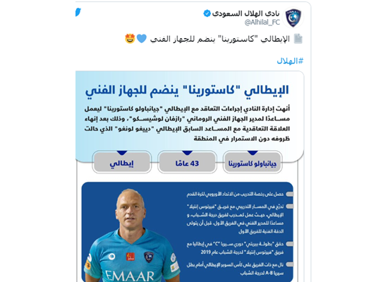 أعلن نادي الهلال السعودي بشكل رسمي تعاقده مع الإيطالي، جيانباولو كاستورينا، لينضم إلى الجهاز الفني بقيادة الروماني، رازفان لوشيسكو، قبل استئناف مسابقة دوري المحترفين .