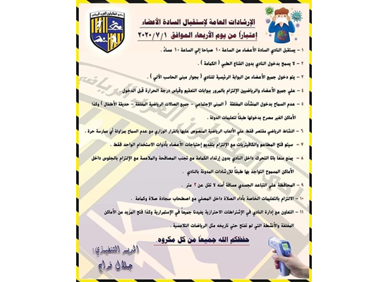 كما قرر النادي التزام المترددين المرور من بوابات التعقيم وقياس درجات الحرارة وعدم السماح للأعضاء بالدخول للاماكن المغلقة مثل الصالات الرياضية والمبني الإجتماعي وحديقة الطفل.