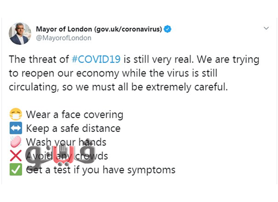 وكتب صادق خان تغريدة على تويتر "لا يزال تهديد # COVID19 حقيقيًا جدًا. نحن نحاول إعادة فتح اقتصادنا بينما الفيروس لا يزال ينتشر، لذلك يجب أن نكون جميعًا حذرين للغاية.. ارتدوا الكمامات.. حافظوا على التباعد الاجتماعي.. اغسلوا أيديكم.. وتجنبوا الازدحام.. وقوموا بعمل اختبار في حالة وجود أعراض".