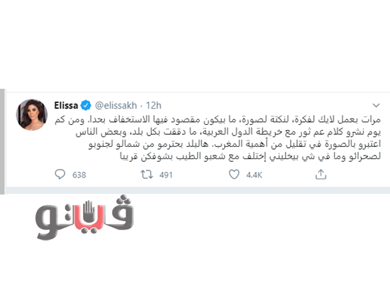 ونفت إليسا وجود أي نية سيئة منها تجاه المغرب وشعبها، قائلة فى تغريدة لها عبر موقع التدوينات القصيرة "تويتر" : "مرّات بعمل لايك لفكرة، لنكتة لصورة، ما بيكون مقصود فيها الاستخفاف بحدا. ومن كم يوم نشروا كلام عم ثور مع خريطة الدول العربية، ما دققت بكل بلد، وبعض الناس اعتبروا بالصورة في تقليل من أهمية المغرب. هالبلد بحترمو من شماله لجنوبه لصحرائه وما في شي بيخليني إختلف مع شعبه الطيب بشوفكن قريبا".