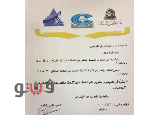 وقالت غرفة صناعة السينما فى بيان أصدرته منذ قليل.. :"انه في يوم الثلاثاء ٢٣ يوليو ٢٠٢٠ اجتمعت اللجنة الثلاثية المتكونة من غرفة صناعة السينما، نقابة السينمائيين و نقابة الفنون التمثيلية بحضور السيد عمر عبدالعزيز رئيس اتحاد النقابات لبحث الشكوى الجديدة التي كانت قد قدمتها السيدة سارة الطباخ ضد الفنان محمد الشرنوبي و قد قدم الشرنوبي ما يفيد انه أقام دعوى قضائية على شركة إيرث برودكشن لفسخ العقد لعدم التزام الشركة بالتزماتها الواردة في العقد فقد قررت اللجنة الثلاثية برفض طلب ايقاف الفنان لعدم اختصاص اللجنة حيث إن القضية امام القضاء الآن".