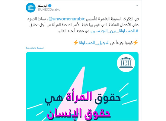 وكتبت اليونسكو تغريدة على تويتر "في الذكرى السنوية العاشرة لتأسيس @unwomenarabic، نسلط الضوء على الأعمال المذهلة التي تقوم بها هيئة الأمم المتحدة للمرأة من أجل تحقيق #المساواة_بين_الجنسين في جميع أنحاء العالم.. كونوا جزءاً من #جيل_المساواة"