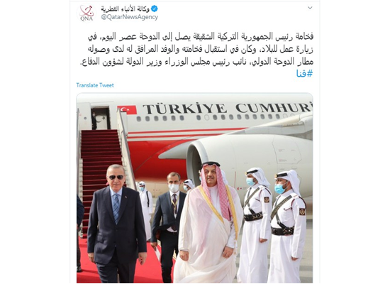 وكتبت وكالة الأنباء القطرية "قنا" تغريدة على تويتر قالت فيها: "فخامة رئيس الجمهورية التركية الشقيقة يصل إلى الدوحة عصر اليوم، في زيارة عمل للبلاد، وكان في استقبال فخامته والوفد المرافق له لدى وصوله مطار الدوحة الدولي، نائب رئيس مجلس الوزراء وزير الدولة لشؤون الدفاع"