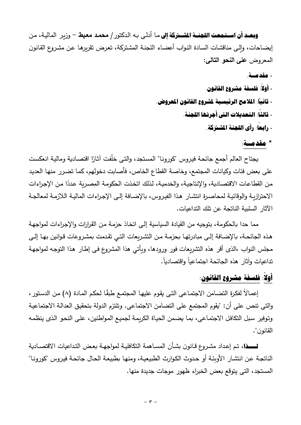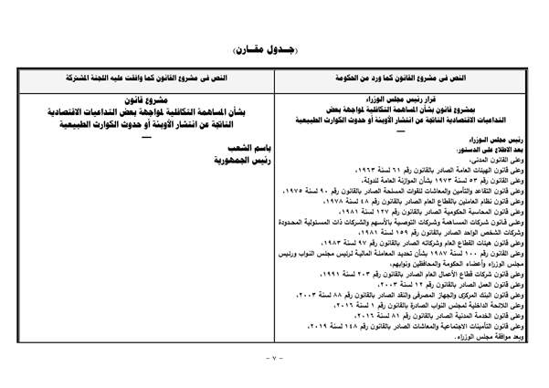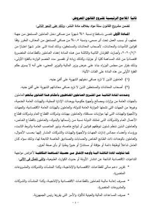 ويهدف مشروع القانون المكون من ٧ مواد، إلى مواجهة بعض التداعيات الاقتصادية الناتجة عن انتشار الأوبئة أو حدوث بعض الكوارث الطبيعية ومنها جائحة فيروس كورونا المستجد، والتي يتوقع بعض الخبراء ظهور موجات جديدة منها.