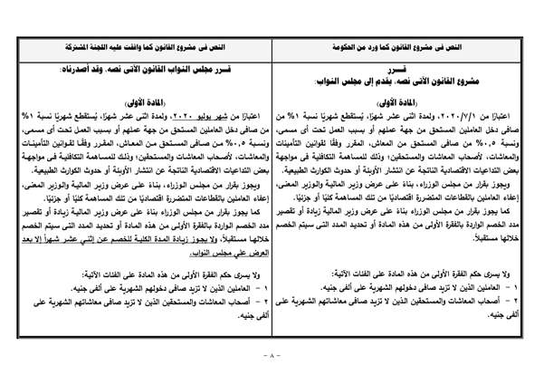 وتضمن مشروع القانون استقطاع نسبة 1% شهرياً من صافي دخل العاملين المستحق من جهة عملهم أو بسبب العمل تحت أي مسمى، ونسبة 0.5% من صافي المستحق من المعاش، المقرر وفقاً لقوانين التأمينات والمعاشات، لأصحاب المعاشات والمستحقين، وذلك لمدة اثني عشر شهراً اعتباراً من 1/7/2020.