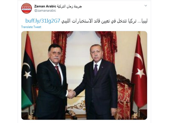 أكدت صحيفة "الزمان" التركية أن الرئيس التركي رجب أردوغان يحاول فرض سيطرته وفرض الأجندة التركية بالدفع برئيس لجهاز الاستخبارات الليبي، من خلال تسمية رئيس المخابرات الليبي في حكومة فايز السراج خاصة بعد مد طرابلس بالمرتزقة والسلاح والتدريب.