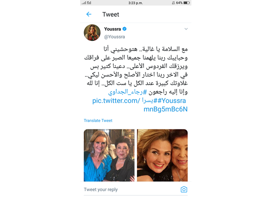 نعت الفنانة يسرا عبر حسابها الشخصي على موقع التغريدات الشهير "تويتر"، الفنانة الراحلة رجاء الجداوي، والتي وافتها المنية صباح اليوم الأحد عن عمر ناهز 82 عاما بعد معاناة مع فيروس كورونا.