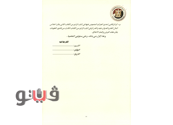 إقرار بعدم صدور أحكام وقرارات ضده ، وتعتبر جميع الأوراق والمستندات التي تقدم أوراقا رسمية في تطبيق أحكام قانون العقوبات .