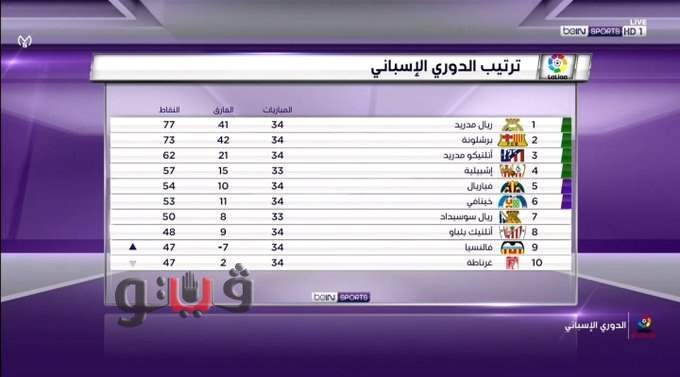 انتهت الجولة الرابعة والثلاثون في الدوري الإسباني حيث يواصل برشلونة صراع الصدارة مع ريال مدريد بفارق 4 نقاط لصالح الميرنجي الذي يملك في رصيده 77 نقطة، بينما برشلونة يملك 73 نقطة في الوصافة.