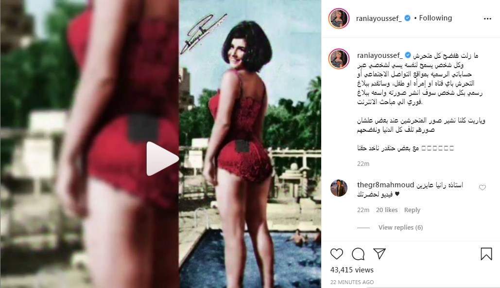 بثت الفنانة رانيا يوسف مقطع فيديو لعدد من فناني الزمن الجميل "سعاد حسني ونادية لطفي ومديحة كامل" بملابس البحر، مههدة إنها ستفضح كل متحرش يسيء لها عبر حساباتها الرسمية بمواقع التواصل الاجتماعي "فيس بوك وتويتر وإنستجرام" وستتقدم ببلاغ رسمي لمن يتحرش بها إلي مباحث الإنترنت وستنشر صورة واسم المتحرش.