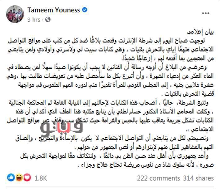 كتب تميم يونس عبر صفحته الرسمية بموقع التواصل الاجتماعي "فيس بوك": "توجهت صباح اليوم إلى شرطة الإنترنت وقدمت بلاغًا ضد كل من كتب على مواقع التواصل الاجتماعي متهمًا إياي بالتحرش بفتيات ، وهي كتابات سببت لي ولأسرتي وأولادي ولمن يتابعني من المعجبين بما أقدمه لهم ، إزعاجًا شديدًا".