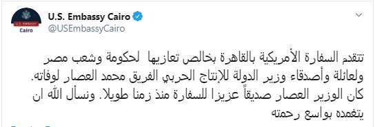 وكتبت السفارة الأمريكية تغريدة على تويتر "تتقدم السفارة الأمريكية بالقاهرة بخالص تعازيها لحكومة وشعب مصر ولعائلة وأصدقاء وزير الدولة للإنتاج الحربي الفريق محمد العصار لوفاته"