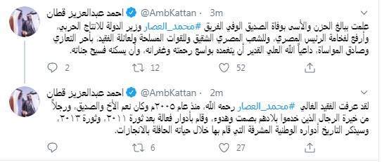 وكتب أحمد عبد العزيز قطان تغريدة على تويتر قال فيها: "علمت ببالغ الحزن والأسى بوفاة الصديق الوفي الفريق #محمد_العصار وزير الدولة للانتاج الحربي، وأرفع لفخامة الرئيس المصري، وللشعب المصري الشقيق وللقوات المسلحة ولعائلة الفقيد، بأحر التعازي وصادق المواساة، داعياً الله العلي القدير أن يتغمده بواسع رحمته وغفرانه، وأن يسكنه فسيح جناته"