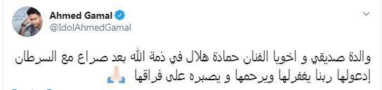 وكتب أحمد جمال تغريدة على تويتر "والدة صديقي و اخويا الفنان حمادة هلال في ذمة الله بعد صراع مع السرطان إدعولها ربنا يغفرلها ويرحمها ويصبره على فراقها"