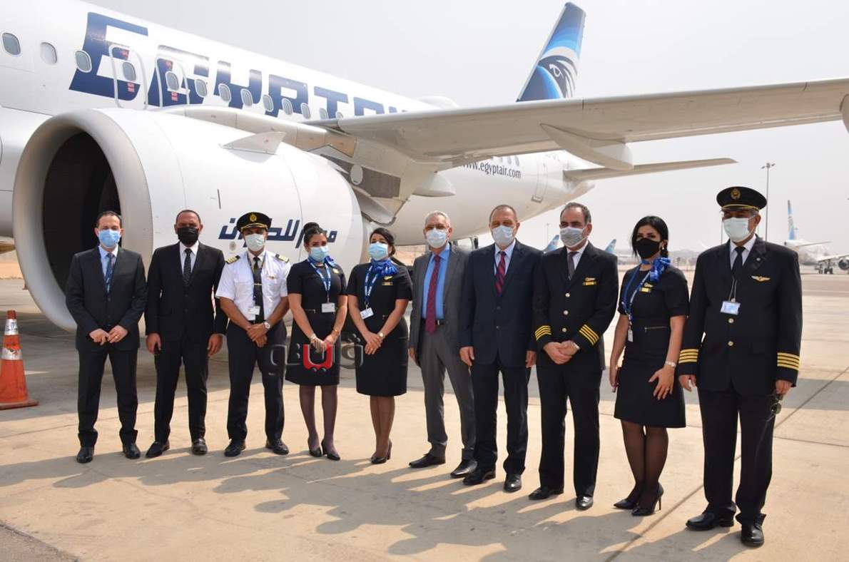 وكان في استقبال الطائرة الجديدة بمطار القاهرة الطيار عمرو ابو العينين رئيس شركة مصرللطيران للخطوط الجوية والطيار حسن منير مساعد حسن منير مساعد رئيس مجلس إدارة شركة مصرللطيران للخطوط الجوية ولفيف من قيادات مصرللطيران.