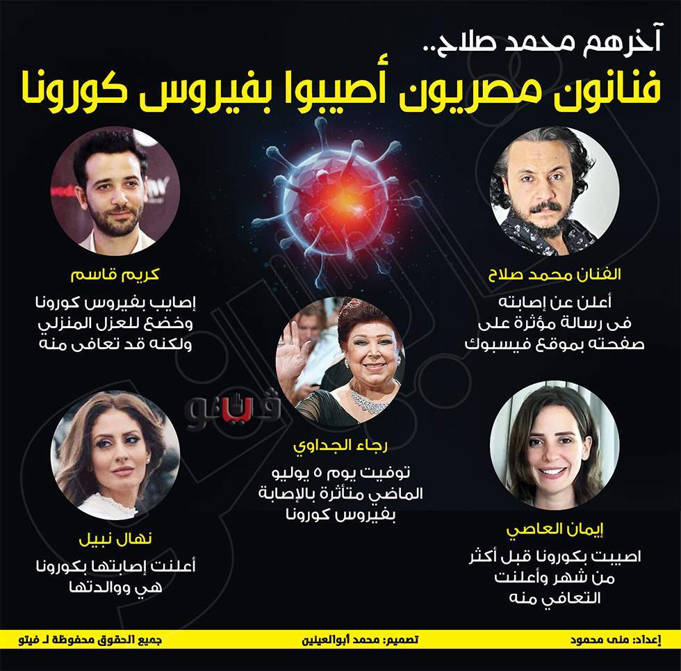 آخرهم محمد صلاح .. فنانون مصريون أصيبوا بفيروس كورونا| إنفو جراف السبت 11/يوليو/2020 - 05:22 م 7/11/2020 5:22:55 PM فنانون مصريون أصيبوا بفيروس كورونا منى محمود شارك طباعة 18 حجم الخط شارك طباعة رجاء الجداوي نهال نبيل كريم قاسم وفاة رجاء الجداوي