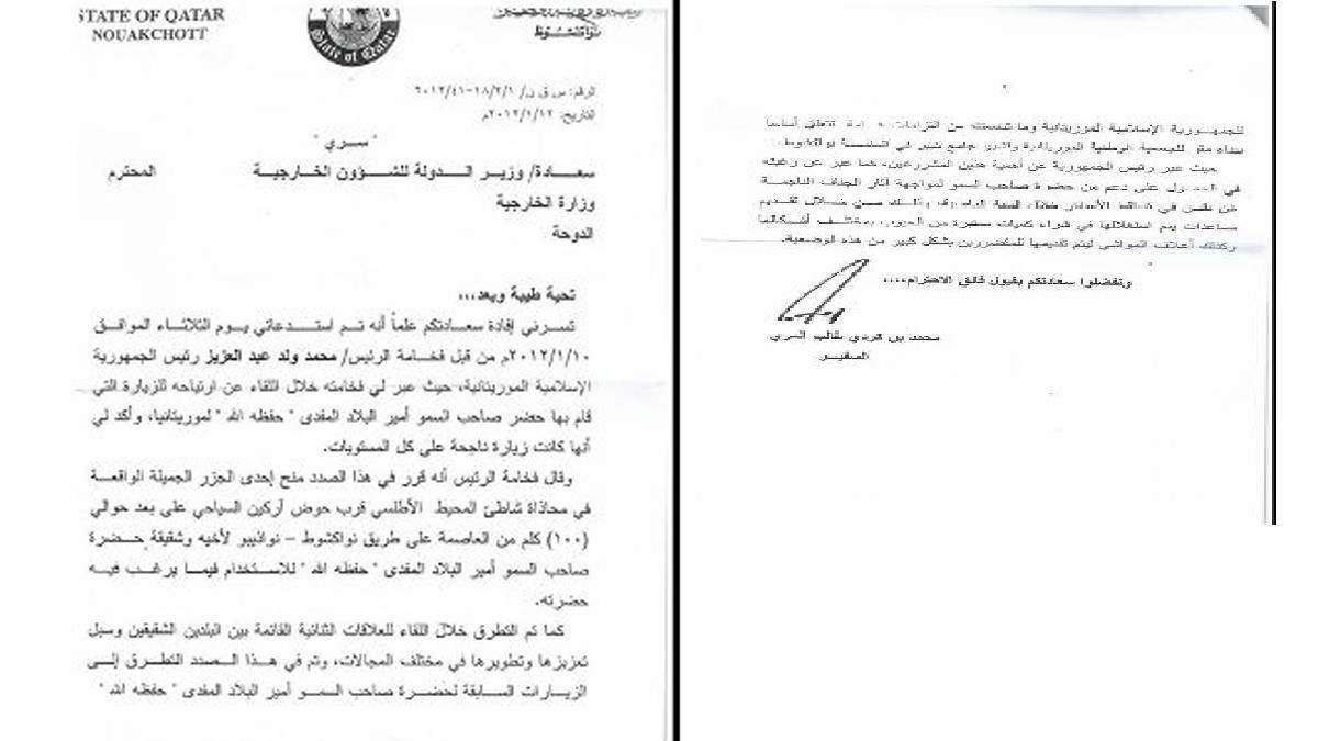 وبحوزة لجنة التحقيق البرلمانية «وثيقة سرية» تتضمن رسالة وجهها السفير القطري بنواكشوط محمد بن كردي طالب المري، يوم 12 يناير 2012، إلى وزارة الخارجية القطرية تفيد بأن ولد عبد العزيز «قرر منح إحدى الجزر الجميلة الواقعة في محاذاة شاطئ المحيط الأطلسي قرب حوض آرجين السياحي».