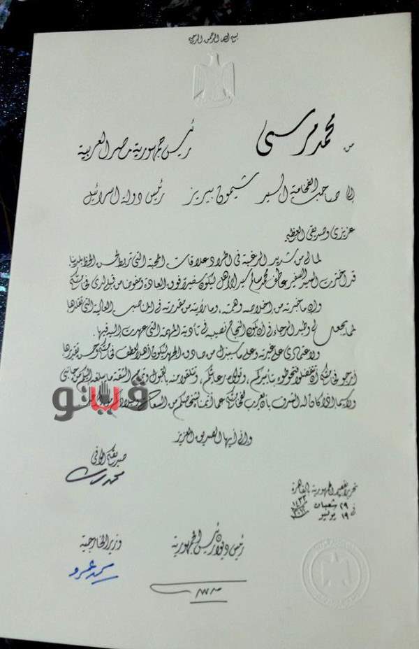 وسبق وان أرسل الرئيس المعزول محمد مرسي عام 2012 خطابا الي الرئيس الإسرائيلي السابق شيمون بيريز وصفه فيه بالصديق العظيم واشار فيه الي انه يريد أن يطور فيه علاقات المحبة مع إسرائيل وذلك ضمن خطاب تعيين السفير المصري السابق بتل أبيب السفير عاطف محمد سالم سيد الأهل.