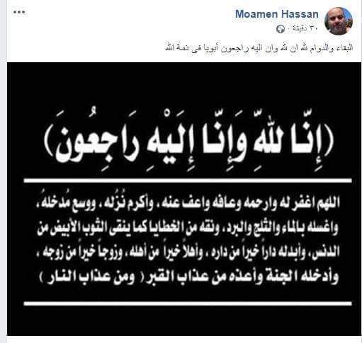 وكتب مؤمن حسن قائلا: "البقاء والدوام لله.. إنا لله وإنا إليه راجعون.. أبويا في ذمة الله".