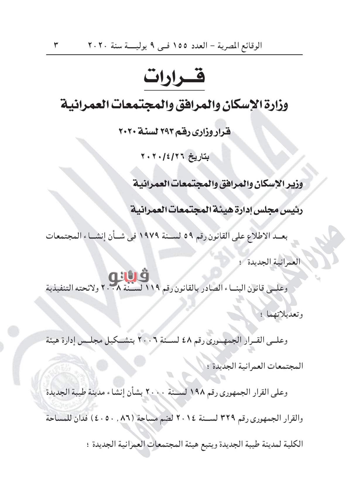 نشرت جريدة الوقائع المصرية في عددها رقم 155، الصادر في 9 يوليو 2020، قرار وزارة الإسكان والمرافق والمجتمعات العمرانية رقم 293 لسنة 2020، بشأن اعتماد المخطط التفصيلي للامتداد العمراني لمدينة طيبة الجديدة وإنشاء المدينة ويتبع هيئة المجتمعات العمرانية الجديدة كامتداد عمراني لمدينة طيبة الجديدة.