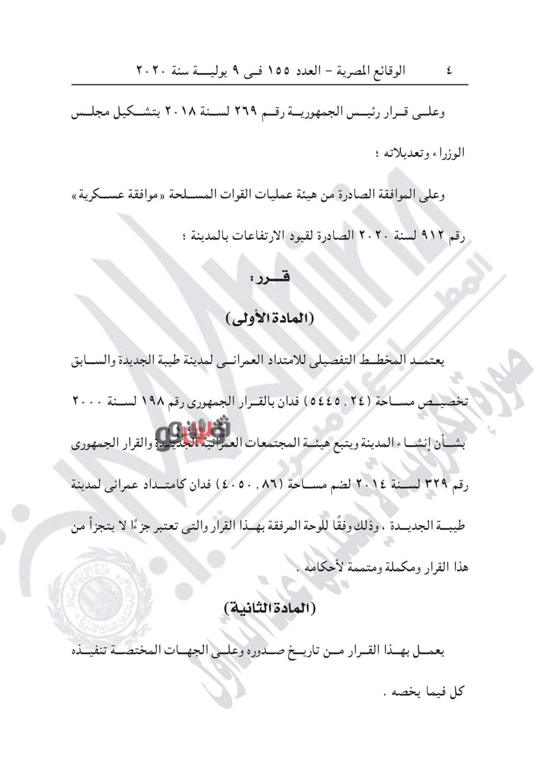 وينص القرار في مادته الأولى على اعتماد المخطط التفصيلي للامتداد العمراني لمدينة طيبة الجديدة والسابق تخصيص مساحة 5445.24 فدان بالقرار الجمهوري رقم 198 لسنة 2000 بشأن إنشاء المدينة ويتبع هيئة المجتمعات العمرانية الجديدة والقرار الجمهوري رقم 329 لسنة 2014، لضم مساحة 4050.86 فدان كامتداد عمراني لمدينة طيبة الجديدة، وذلك وفقًا للوحة المرفقة بهذا القرار، والتي تعتبر جزءاً لا يتجزأ من هذا القرار ومكملة ومتممة لأحكامه.