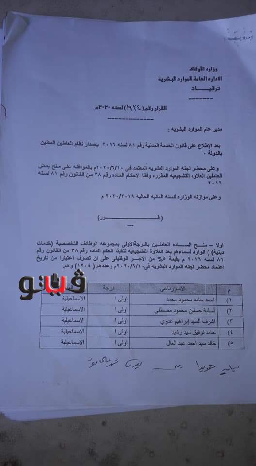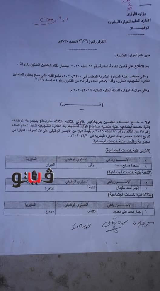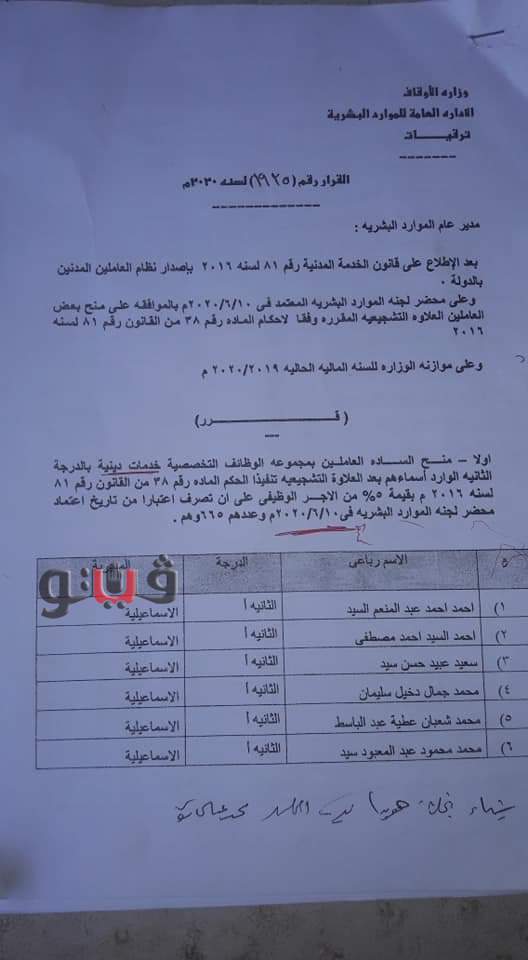 أعلنت إدارة الموارد البشرية بوزارة الأوقاف عن الأسماء المستحقة للعلاوات التشجيعية لعام 2020 وذلك تنفيذاً لحكم المادة رقم 38 من القانون رقم 81 لسنة 2016 بقيمة 5 % من الأجر الوظيفي.