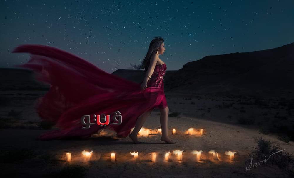 وظهرت رولا، بإطلالة صيفية أنيقة بفستان أحمر مارون حافية القدمين في أحد المناطق الصحراوية التي زينتها بالشموع.