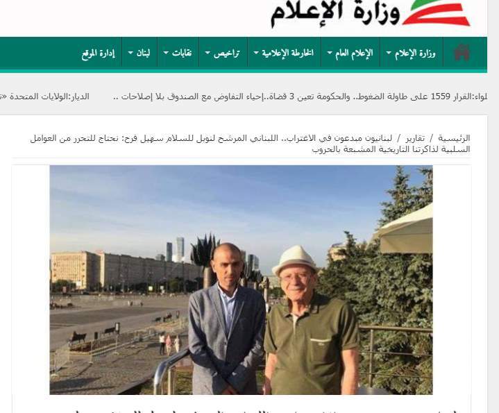 أعادت وزارة الإعلام اللبنانية نشر حوار البروفيسور اللبناني سهيل فرح المرشح لجائزة نوبل للسلام والذي أجرته جريدة وبوابة "فيتو" في عددها الورقي والذي يحكي فيه عن ترشيحه للجائزة والصراعات التي تشهدها المنطقة على مختلف الجبهات في الشرق الأوسط.