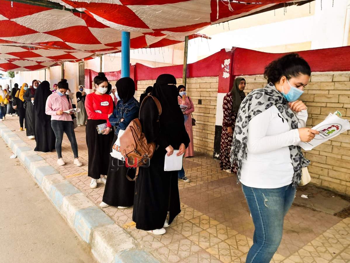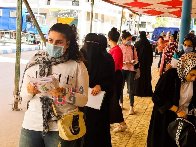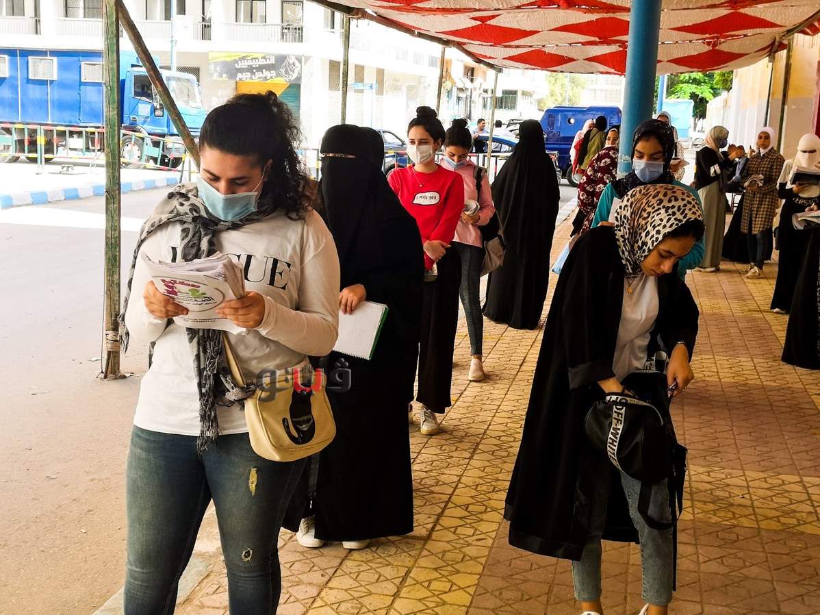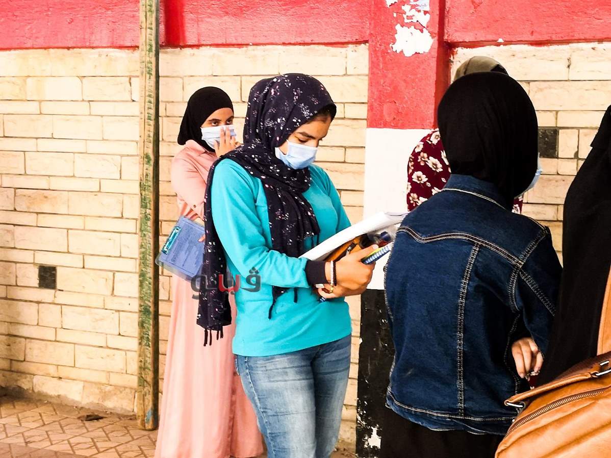 وألتزمت الطالبات بإرتداء الكمامات والفيس شيلد وسط تنظيم بينهم بالتباعد الاجتماعي أمام اللجان تمهيدا للدخول، حيث تم تنظيمهم في صفوف بين كل طالب والاخر متر ونصف مسافة تباعدية.