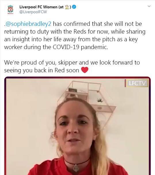 .@sophiebradley2 has confirmed that she will not be returning to duty with the Reds for now, while sharing an insight into her life away from the pitch as a key worker during the COVID-19 pandemic.— Liverpool FC Women (at 🏠) (@LiverpoolFCW) July 12, 2020