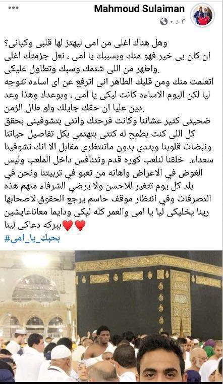 ضحيتى كتير عشاننا وكانت فرحتك وانتى بتشوفينى بحقق كل اللى كنت بطمح له كنتى بتهتمى بكل تفاصيل حياتنا ونبضات قلوبنا وبتدى بدون ماتنتظرى مقابل الا انك تشوفينا سعداء. خلقنا لنلعب كوره قدم ونتنافس داخل الملعب وليس الغوض في الاعراض واهانه من تعبو في تربيتنا ونحن في بلد كل يوم تتغير للاحسن ولا يرضي الشرفاء منهم هذه التصرفات وفي انتظار موقف حاسم يرجع الحقوق لاصحابها