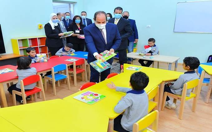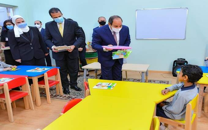 كما تفقد الرئيس إحدى حضانات الأطفال حيث داعب طفل يدعى سيف كما استمع إلى ابيات شعر من أحد الأطفال كما وزع الرئيس هدايا على أطفال الحضانة ودون الرئيس السيسي إهداء بخط يده لطفلة تدعى ساندي... وكتب الرئيس عبارة إلى ابنتي ساندي ربنا يحفظك.