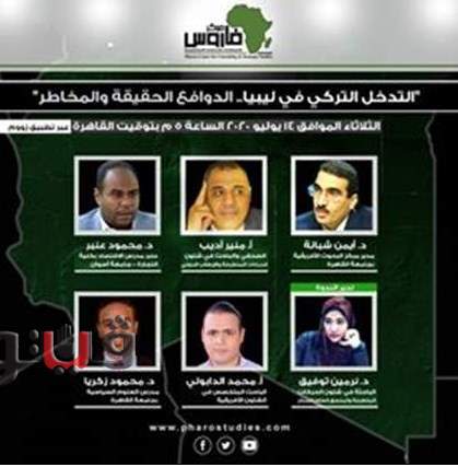 ينظم مركز فاروس للاستشارات والدراسات الإستراتيجية ندوة عبر تطبيق زووم بعنوان "التدخل التركي في ليبيا.. الدوافع الحقيقة والمخاطر" وذلك يوم الثلاثاء الموافق 14 يوليو الجاري.
