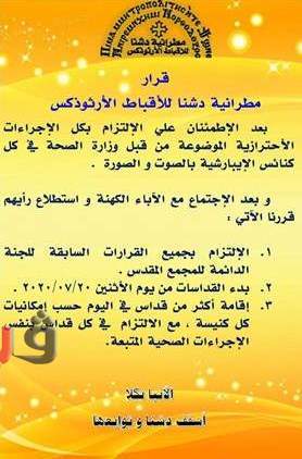 و أشارت إلى أنه بعد الاجتماع مع الآباء الكهنة واستطلاع رأيهم قررنا الآتى الالتزام بجميع القرارات السابقة للجنة الدائمة للمجمع المقدس وبدء القداسات من يوم الإثنين 20/07/2020 وإقامة أكثر من قداس فى اليوم حسب إمكانيات كل كنيسة، مع الالتزام فى كل قداس بنفس الإجراءات الصحية المتبعة.