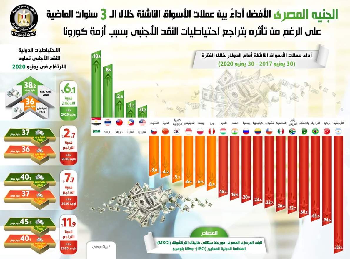 وجاء في الإنفوجراف، تحسن أداء الجنيه المصري ليصبح أفضل العملات أداءً أمام الدولار خلال الفترة من 30 يونيو 2017 حتى 30 يونيو 2020، وذلك بمعدل 10.8%، تليه عملة تايلاند بمعدل تحسن 8.9% أمام الدولار، ثم تايوان بمعدل تحسن 2.8%، والفلبين بمعدل تحسن 1.3%، وماليزيا بمعدل تحسن 0.2%.