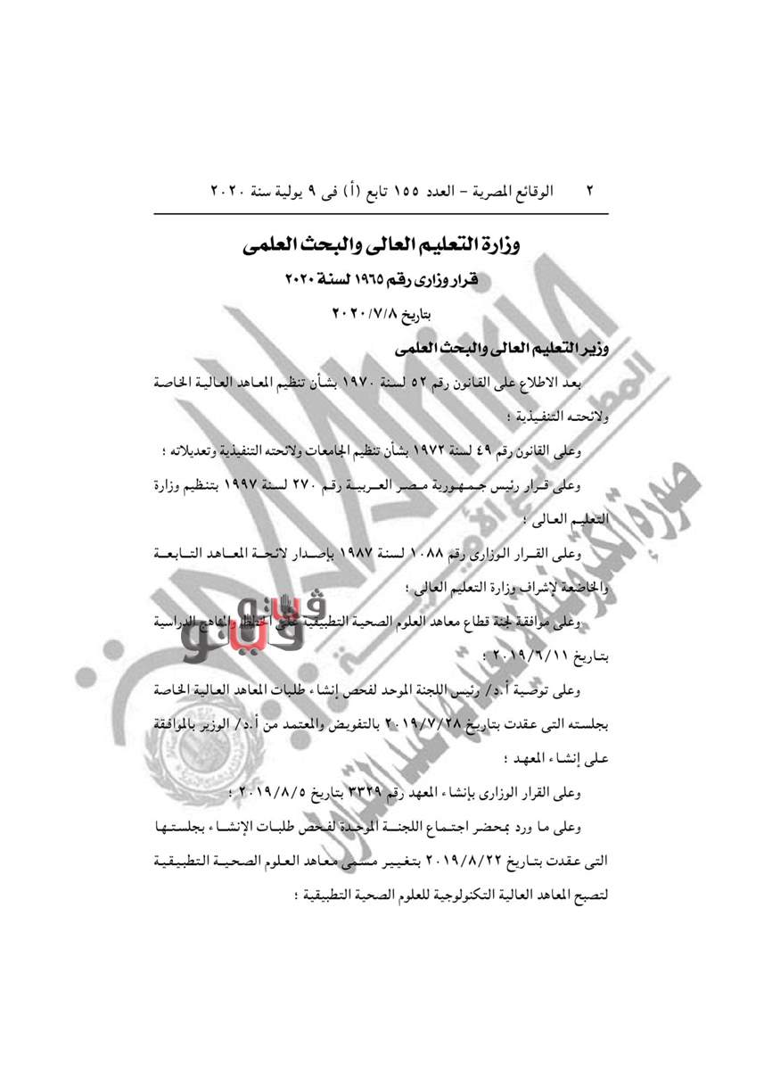 نشرت جريدة الوقائع المصرية في عددها رقم 155 تابع (أ)، الصادر في 9 يوليو 2020، قرار وزارة التعليم العالي والبحث العلمي رقم 1965 لسنة 2020، بشأن بدء الدراسة بالمعهد التكنولوجى العالى للعلوم الصحية التطبيقية بمدينة بدر.