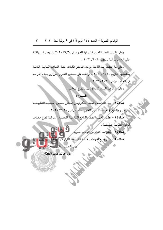 وينص القرار في مادته الأولى على بدء الدراسة بالمعهد التكنولوجى العالى للعلوم الصحية التطبيقية بمدينة بدر والتابع لجمعية دلتا النيل للعلوم للعام الدراسي 2020 /2021