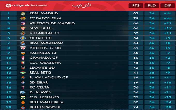 وجاء جدول ترتيب الدوري الإسباني بعد الجولة الـ 36 كالتالي: