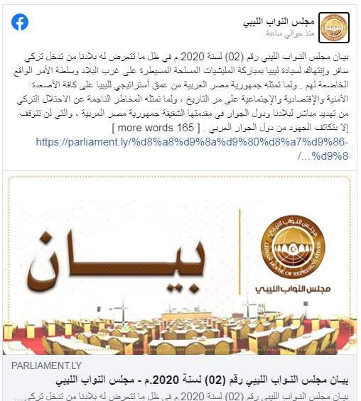 وأضاف "للقوات المسلحة المصرية التدخل لحماية الأمن القومي الليبي والمصري إذا رأت هناك خطر داهم وشيك يطال أمن بلدينا". وتابع: "تصدينا للغزاة يضمن استقلالية القرار الوطني الليبي ويحفظ سيادة ليبيا ووحدتها، ويحفظ ثروات ومقدرات الشعب الليبي من أطماع الغزاة المستعمرين، وتكون الكلمة الُعليا للشعب الليبي وفقًا لإرادته الحرة ومصالحه العليا". وأشار بيان مجلس النواب الليبي إلى أن البلاد تتعرض لتدخل تركي سافر وانتهاك لسيادة ليبيا بمباركة المليشيات المسلحة المسيطرة على غرب البلاد وسلطة الأمر الواقع الخاضعة لهم.