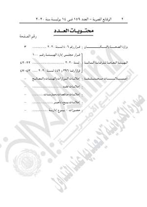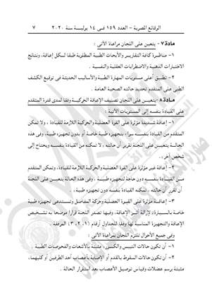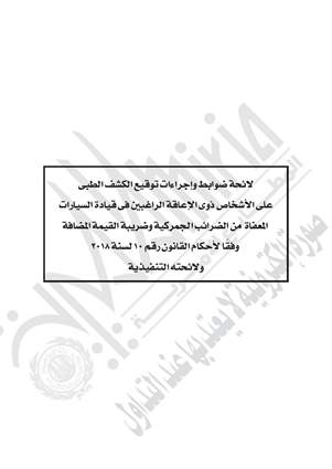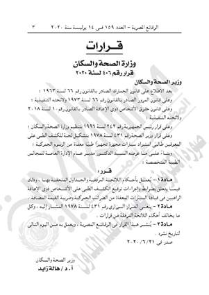 نشرت جريدة الوقائع المصرية في عددها رقم 159، الصادر في 14 يوليو 2020، قرار وزارة الصحة والسكان رقم 406 لسنة 2020، بشأن تحديد ضوابط وإجراءات توقيع الكشف الطبي على الأشخاص ذوى الإعاقة الراغبين في قيادة السيارات المعفاة من الضرائب الجمركية وضريبة القيمة المضافة.